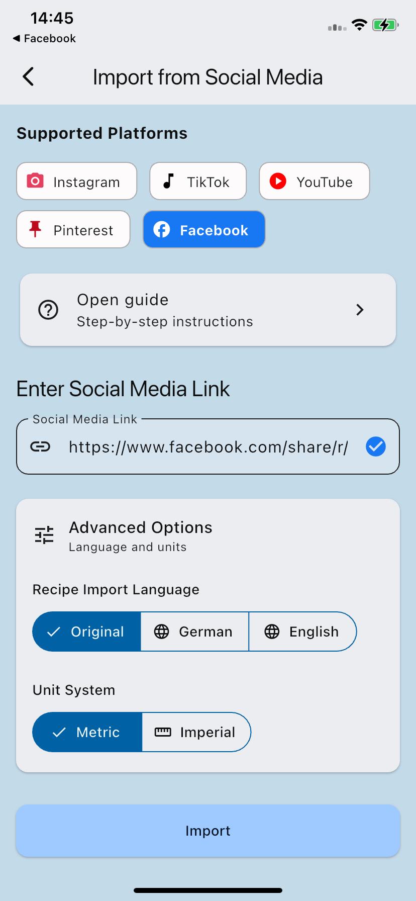 Recipool can import recipes directly from Facebook. You start the import via the share sheet.